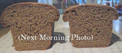 The loaves cut in half the next morning. The one using soaked batter is on the left: (Please click on any of these little photos for a larger images.)