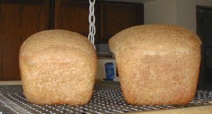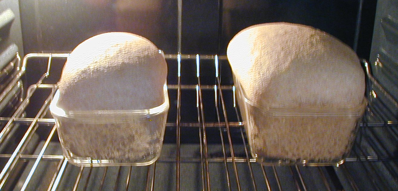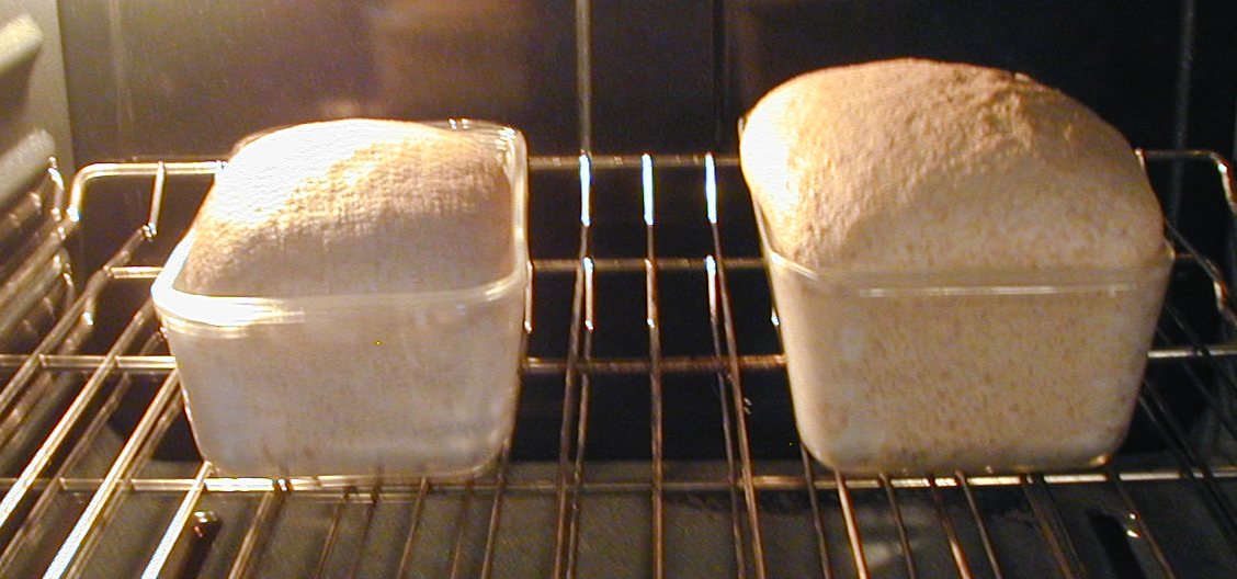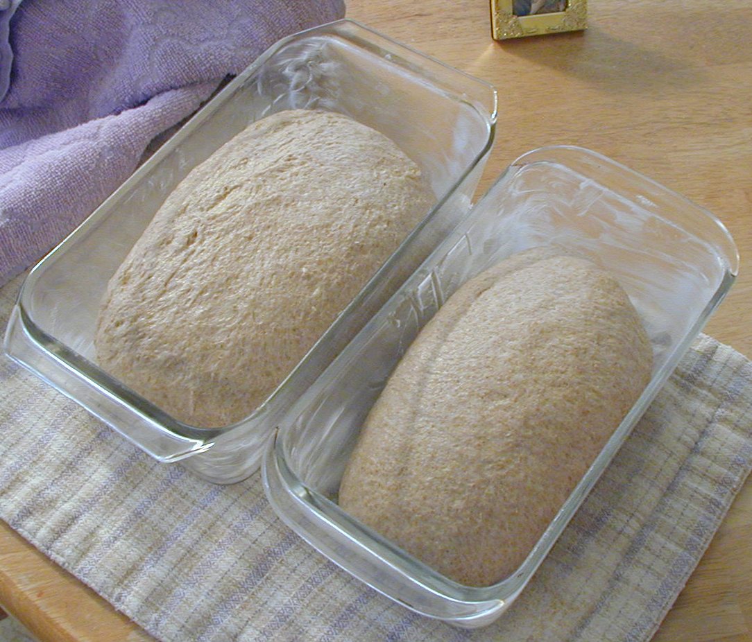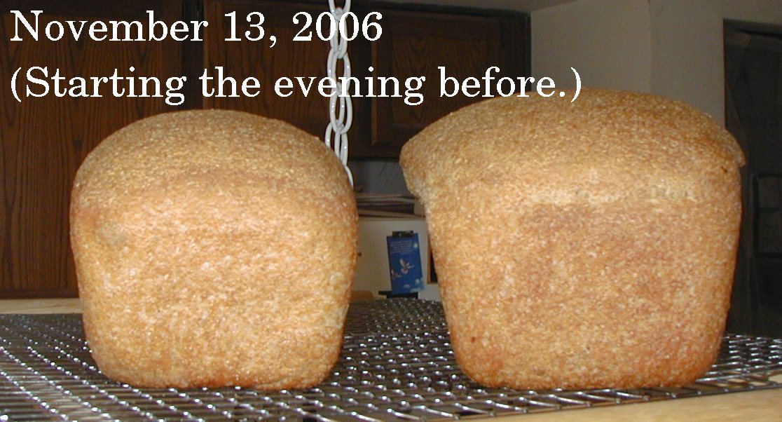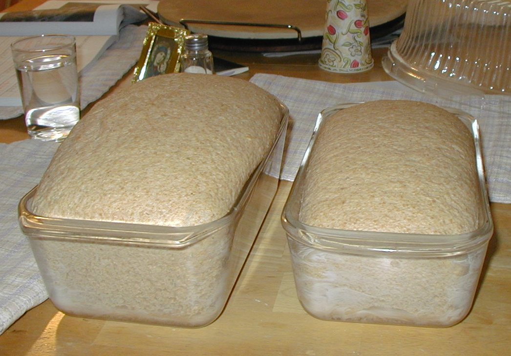 At 5:00 AM the next day, the sponge looked great. I made the dough, adding a toppy Tbs of olive oil, a toppy teas. of honey, and a toppy 1/2 teas of salt and the rest whole wheat flour. I kneeded as usual with butter knife and then by hand. I let that rise for almost 4 hours. It had definitely doubled by then! I made the loaves at 9:00 AM and took this photo (below) at 9:20. Click on any imagae for larger view.